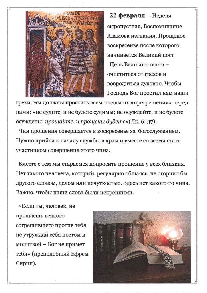 «Покаяния отверзи ми двери, Жизнодавче, утренюет бо дух мой ко храму святому Твоему, храм носяй телесный весь осквернен; но яко щедр, очисти благоутробною Твоею Милостию.»